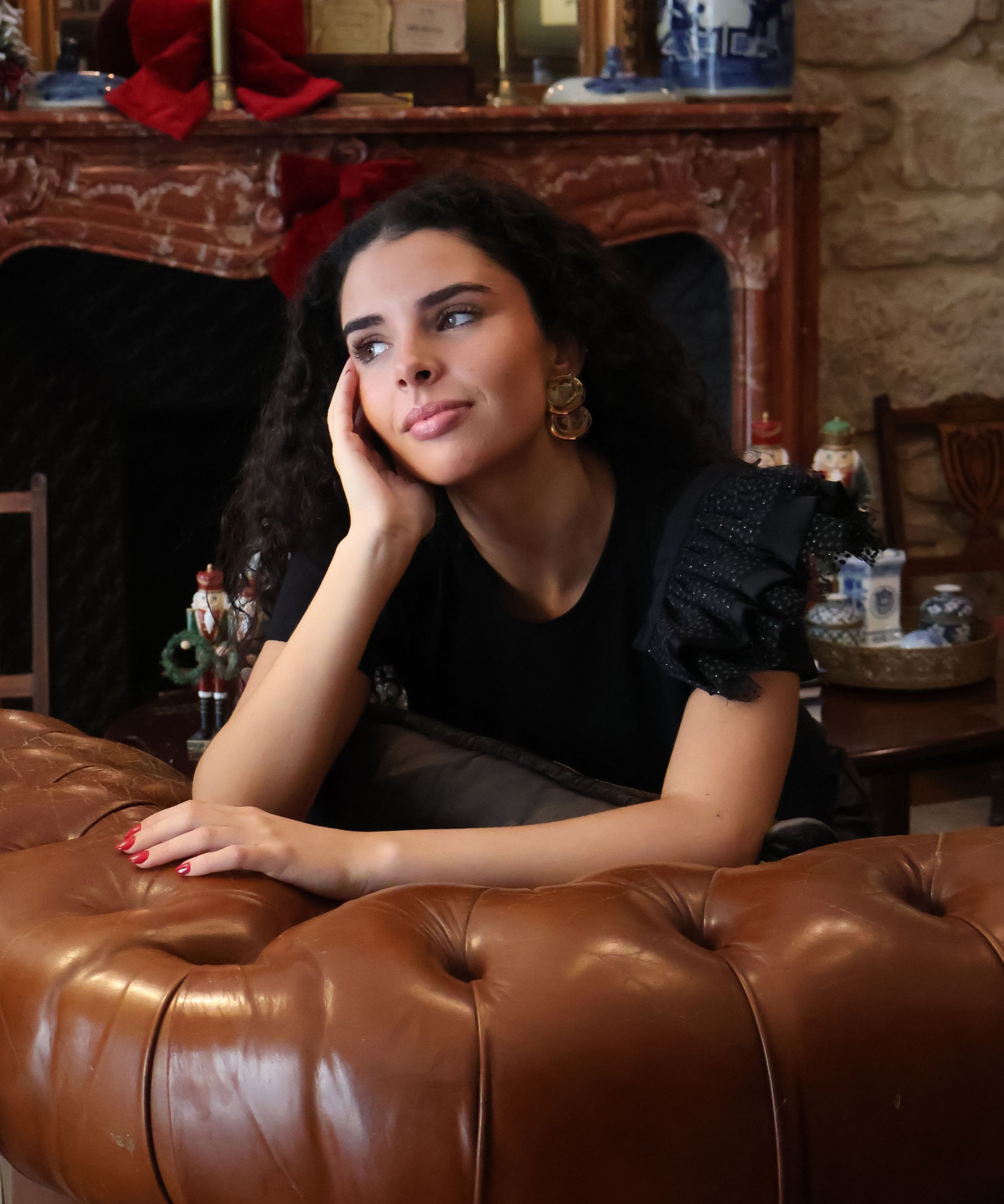Crafted from a sophisticated combination of sheer black tulle with shimmering dots and black sablé fabric, this accessory offers a contrast of textures and dramatic volume.