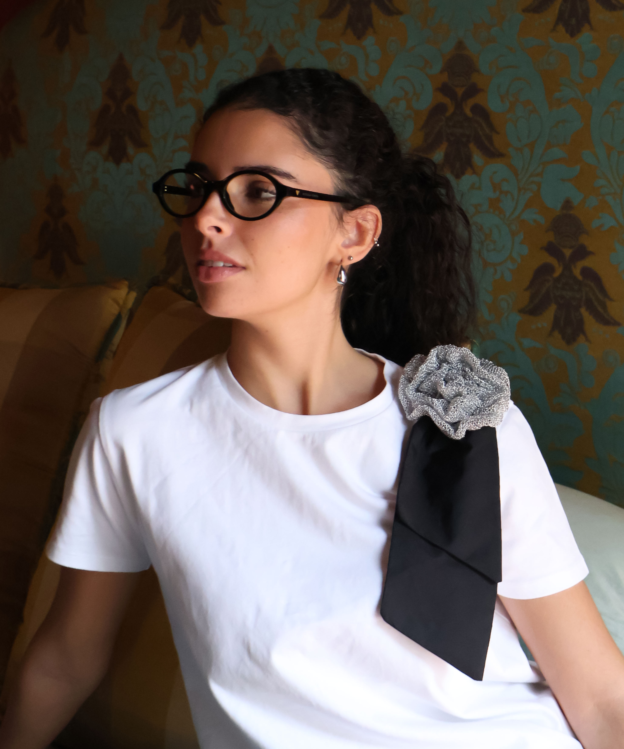 The subtle sheen and richness of the silk fabric contrast perfectly with the modernity of the metallic flower, making this accessory ideal for those who seek luxury in the details.